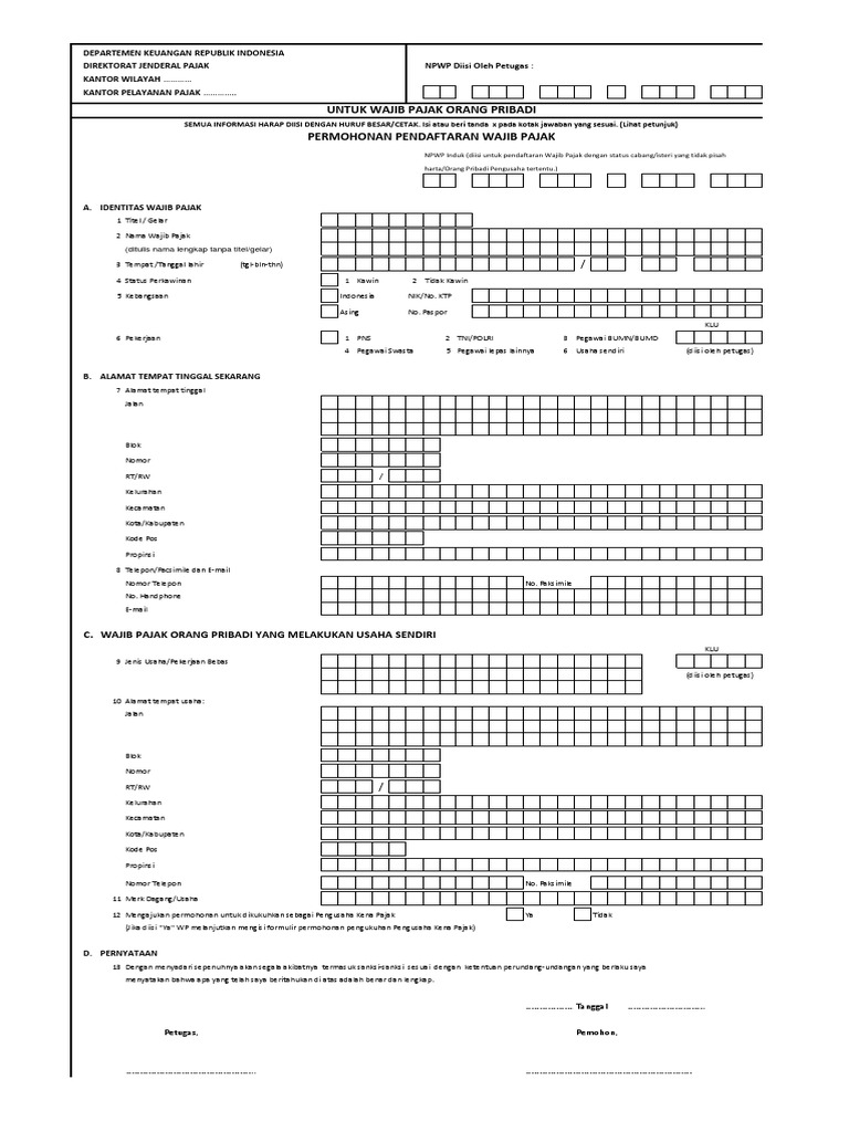 Dokumen yang harus dibawa saat melakukan pendaftaran npwp usahawan/umkm serta tata cara pengisian formulir npwp. Isi formulir permohonan pendaftaran npwp yang didapat langsung di kpp, pastikan sesuai dengan data diri kamu. Cara daftar npwp online terbaru 2020, persyaratan membuat npwp pribadi atau perusahaan direktorat jenderal pajak (djp) sebenarnya telah lama menyediakan fasilitas pendaftaran npwp. Formulir pendaftaran npwp badan usaha. Kolom isian npwp sebelum isian bagian a diisi oleh wp badan dengan status. Format formulir pendaftaran npwp orang pribadi berikut adalah format gambar, silahkan klik kanan pada gambar, kemudian pilih simpan gambar, setelah itu anda bisa print/cetak formulir.