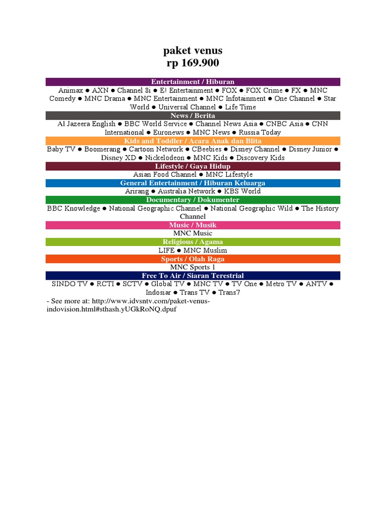 Jenis paket channel di indovision. Dari daftar paket indovision kita dapat banyak channel dan itupun masih bisa di tambah lagi dengan upgrade indovision dengan berbagai pilihan. Harga resmi paket mars, venus, galaxy dan super galaxy hingga paket tambahan (al carte) cinema 1,2. Bayar 9 bulan free 3 bulan. Channel yang dikhususkan untuk menampilkan video promo indovision seperti harga/diskon untuk pemasangan indovision tiap bulannya, daftar paket. Bulan ke 13 bayar iuran minimal 109.900/ bulan. Unduh versi terbaru indovision untuk android.
